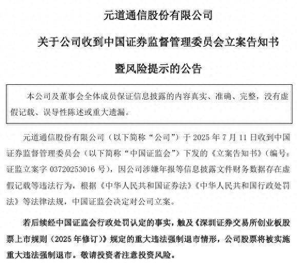 7月11日晚间,通信技术服务商元道通信发布公告称,因公司涉嫌年报等信息披露文件财务数据存在虚假记载等违法行为,证监会决定对其立案。